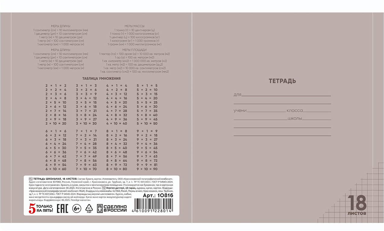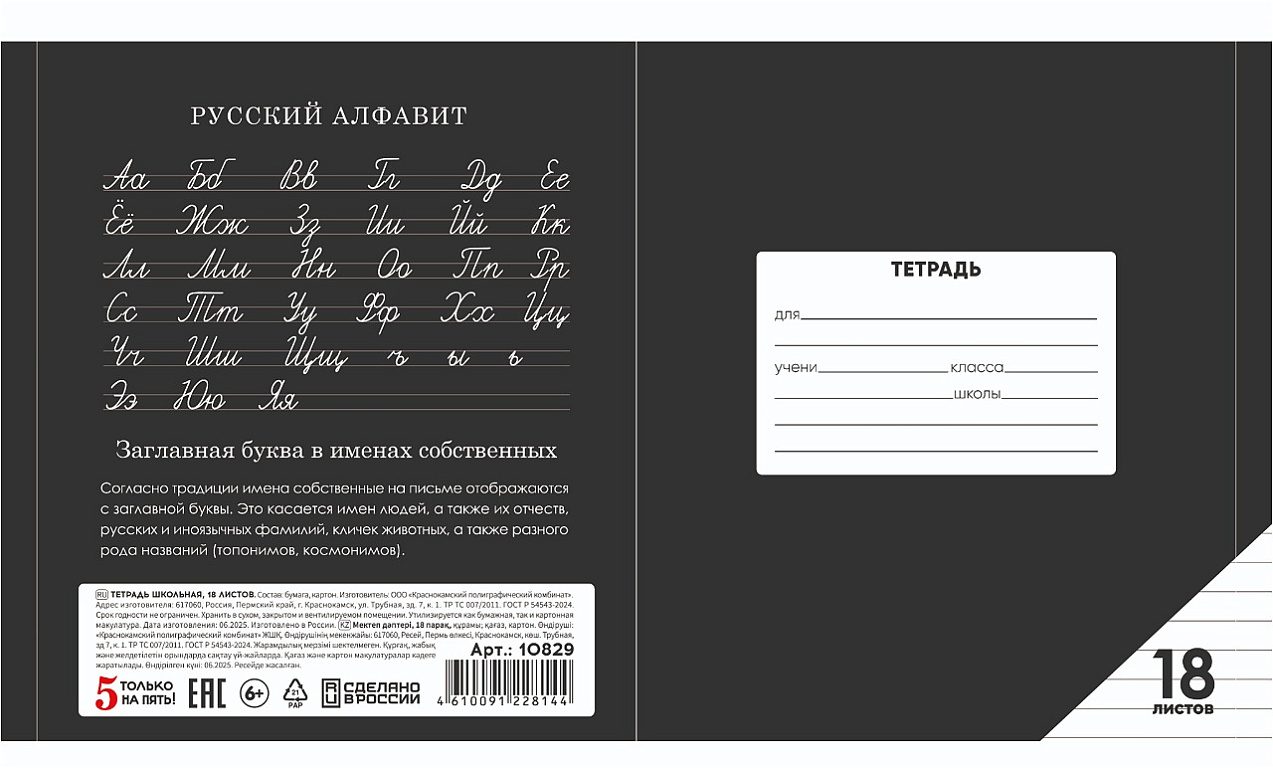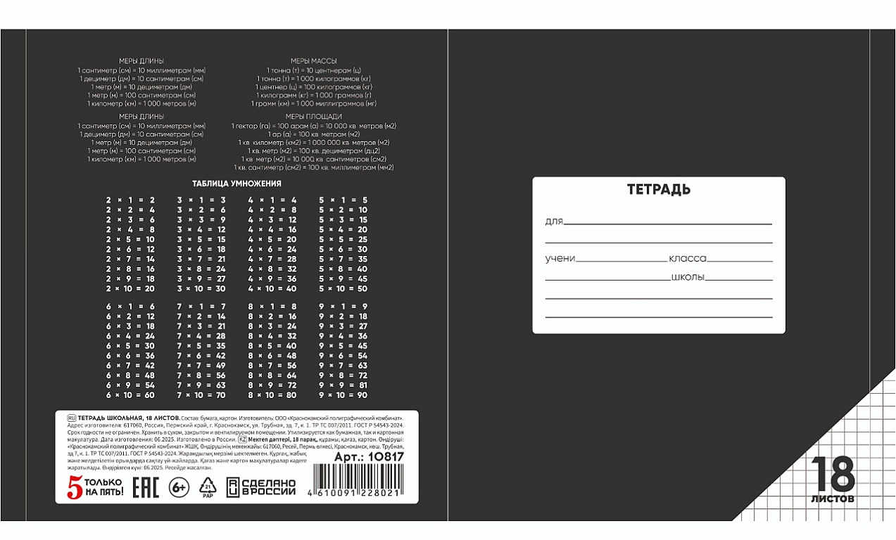 Тетрадь 18 листов в клетку "ЧЕРНАЯ" обложка из мелованного картона(200 г/м²) блок офсет 60 г/м², 92%ТМ: 5 только на пять