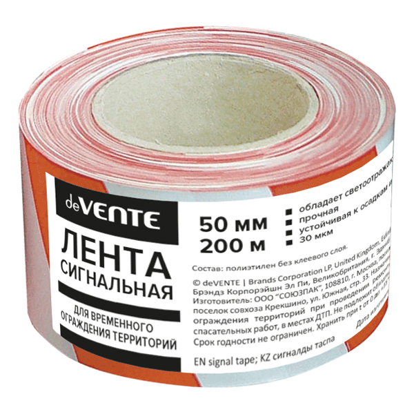 Лента сигнальная "deVENTE" красно-белая, 50 ммx200 м, полиэтилен без клеевого слоя, картонная втулкаТМ: deVENTE