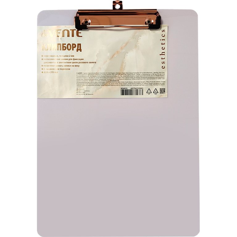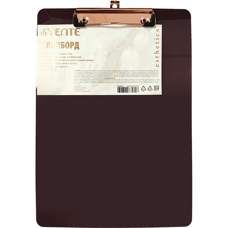 Планшет с зажимом А4 "deVENTE. Esthetics" лавандово-пепельный, толщина 2 мм, с выдвижным подвесом, в пластиковом пакете, с металлическим прижимом цвета розового золота A4 (225x315 мм)